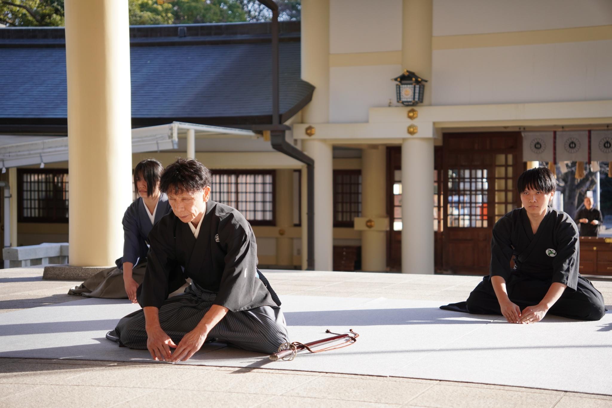◉武士の伝統的な作法を踏襲しつつも、いつでも即座に動けるように工夫された座り方も、特徴の一つです。股間を大きく開くこの独特な座り方は、流儀の実戦的な座り方です。